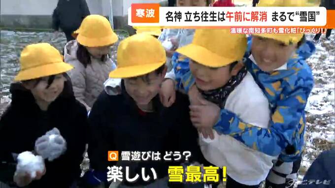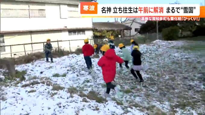 内海小学校では登校時には校庭の一部に雪がつもり、急遽、午前中の授業が「雪遊び」に変わった学年も。