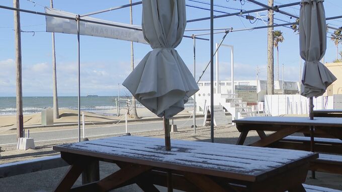 夏は海水浴客で賑わうビーチ 海の家の屋根も薄化粧