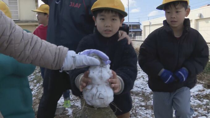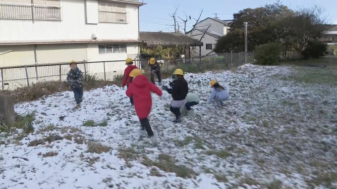内海小学校では登校時には校庭の一部に雪がつもり、急遽午前中の授業が「雪遊び」に変わった学年も。