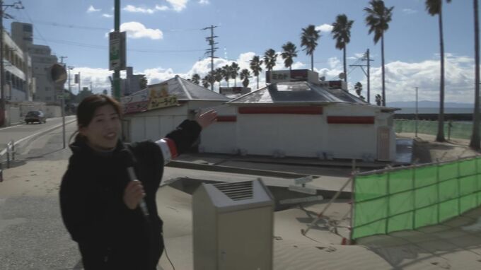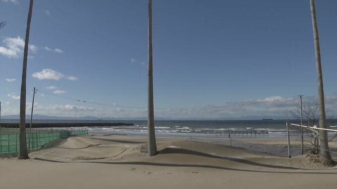「夏は海水浴客で賑わうこちらのビーチ。海の家の屋根には雪がうっすらと残っています」