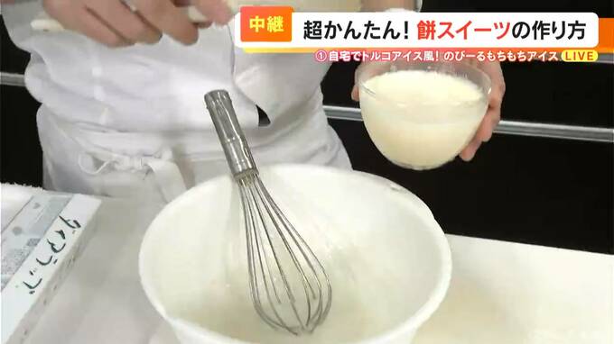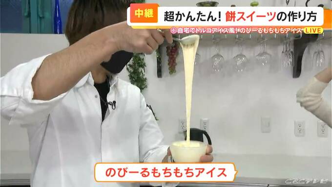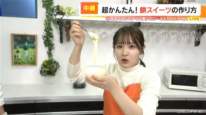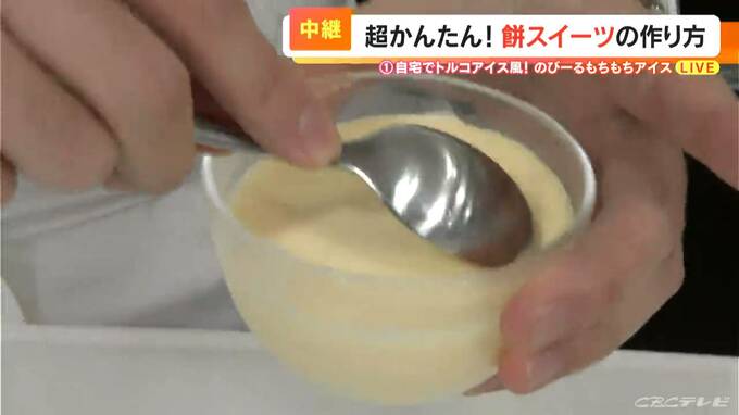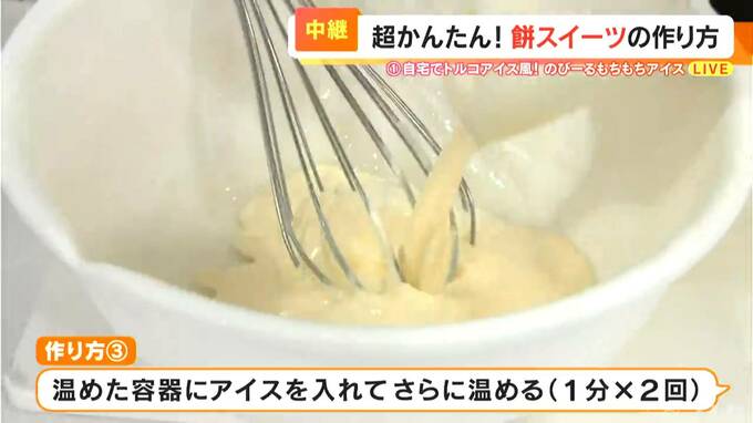 混ぜていくと、トロトロになってきましたね。おお、伸びました!すごい!こんなに伸びますか!では、お味の方は…美味しいです!バニラの甘さがしっかりあって、食感は、お餅のもちもちした感じというより、トロトロした感じ。たまらないです。