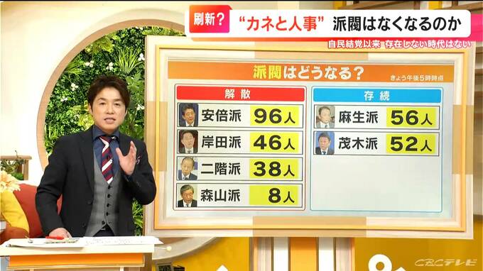 世論の批判を受けて、解散の方向へ舵を切る派閥が相次いでいます。安倍派(96人)、岸田派(46人)、二階派(38人)、森山派(8人)。一方で、存続の意思を示しているのが、麻生派(56人)と茂木派(52人)ということになるんですが(26日午後5時現在)、“派閥”はなくなるのかどうか、政治に詳しい愛知学院大学の森正教授に聞きました。