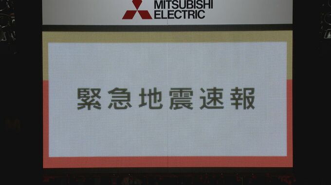 「緊急地震速報がありました。試合を中断します。強い揺れに警戒してください」