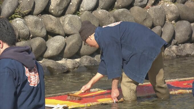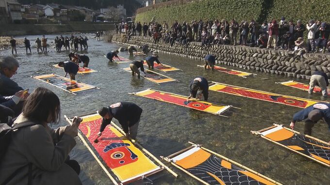 郡上市八幡町を流れる小駄良(こだら)川で行われる3メートルほどもある鯉のぼりの「寒ざらし」。鯉のぼりに使われる「郡上本染」は400年以上の歴史がある藍染の一種で、水温4度の冷たい川にさらし模様を描く際に使った糊を特製のおたまとブラシで丁寧に洗い流すと、布が引き締まり鯉のぼりの赤や黄、紺がいっそう色鮮やかに浮かび上がります。
