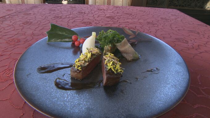 「こちらはメインのお肉料理になります。トリュフと『つま菊』とアーモンドを使ったお料理です。」