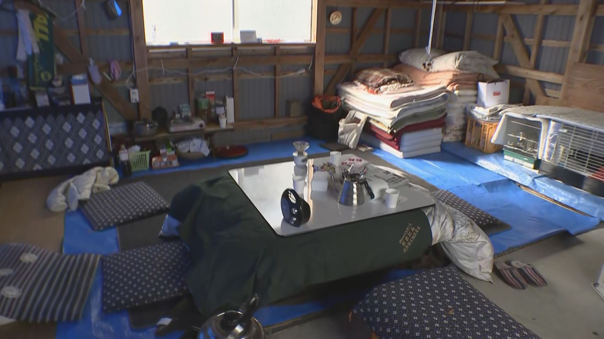 自宅が倒壊した輪島市の畑中優実さん(54)。ペットのウサギとハトと一緒に暮らすため車庫で過ごしています。