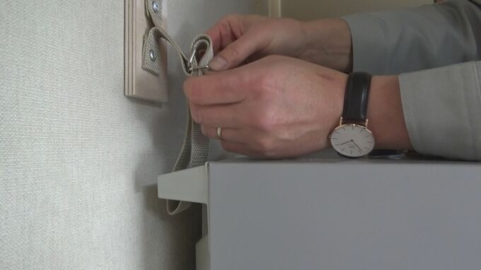 動きやすい食器棚は下に滑り止めのシートを差し込み、壁にぴったりくっつけることで倒れにくくなります。また、棚の中は上の方に軽いもの下の方に重いものを入れて重心を下げることも効果的だといいます。