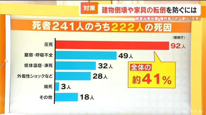 今、改めて注目されている家具の固定がどれほど大切なのか。能登半島地震で犠牲になった241人のうち、222人を対象に警察庁が死因を調べたところ、家屋の倒壊や家具の転倒などが原因の「圧死」が92人で、全体の41%と最も多くなっています。