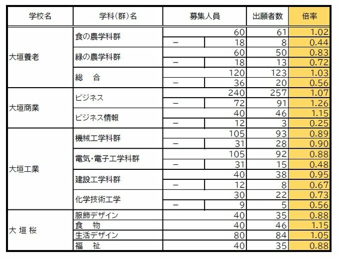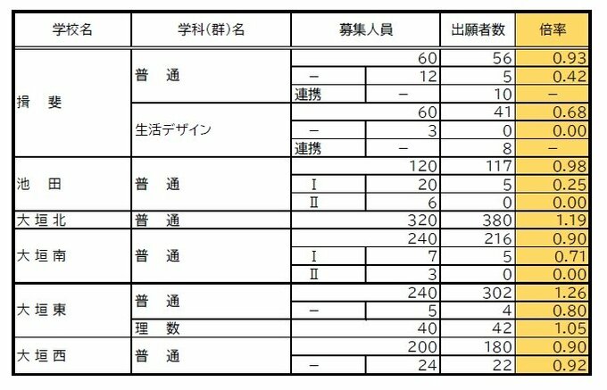 岐阜県公立高校入試2024 出願状況 第一次・連携型選抜の志願倍率 岐阜1.27倍 大垣北1.19倍 斐太1.04倍