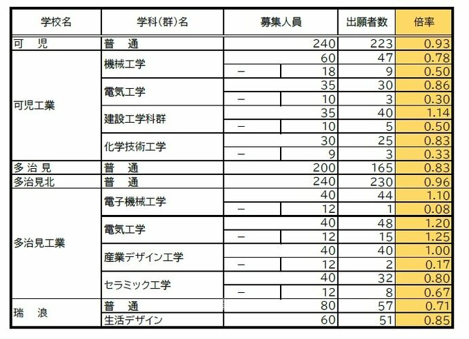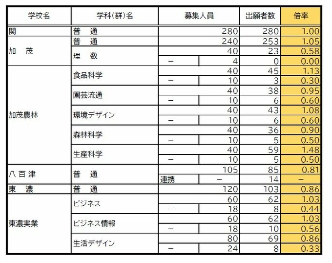 岐阜県公立高校入試2024 出願状況 第一次・連携型選抜の志願倍率 岐阜1.27倍 大垣北1.19倍 斐太1.04倍