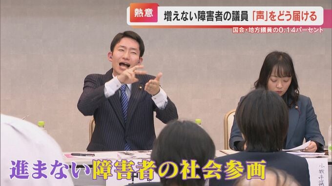 別の日、愛知県内では女性議員、障害のある議員らが活動報告を行いました。中島さんがこうした活動をしている背景には、障害者の社会参画が進まない現状があります。民間企業で働いている障害者は約64万人。国・地方自治体などの公的機関では約7万3000人と労働人口の2~3%を占め、年々増えています。しかし政治の世界では…。