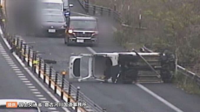 高速道路で車が横転、単独事故発生 山陰道・上り線琴浦船上山IC~琴浦東ICが一時通…