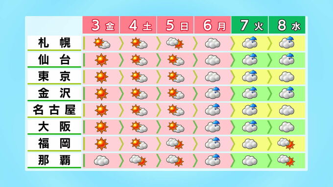連休・ゴールデンウィーク後半の天気は 最終日は西から雨に
