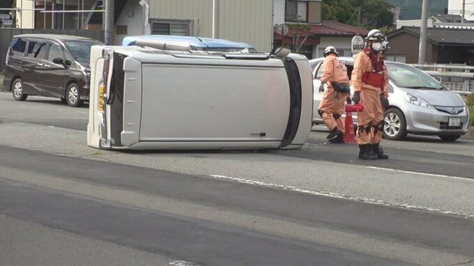 男性2人が病院搬送 県道交差点付近で車3台が絡む多重事故 1台が横転