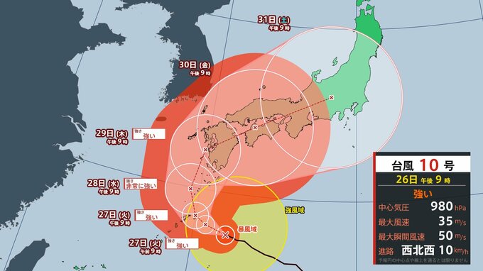 【台風10号サンサン】関東方面に進むか…29日頃に九州に上陸後、四国→中国→近畿→…
