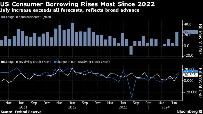米消費者信用残高、7月は255億ドル増-22年11月以来最大の増加