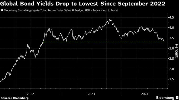 世界の債券利回り、2年ぶり低水準-景気減速懸念や利下げ観測で