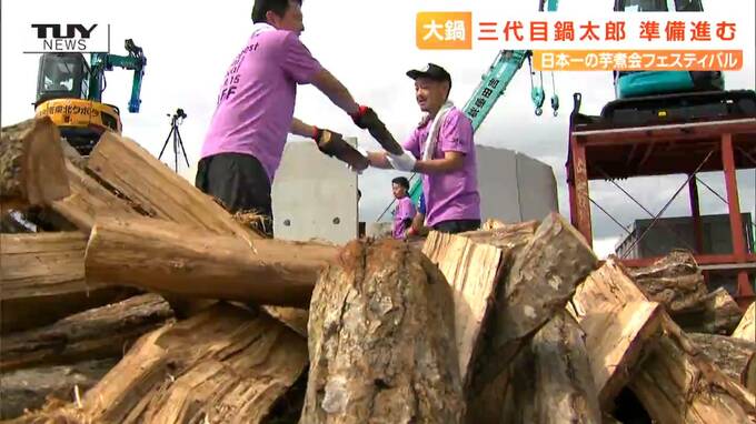 ”日本一の芋煮会フェスティバル” 大鍋用の薪が並べられる 代々伝わる組み方で当…