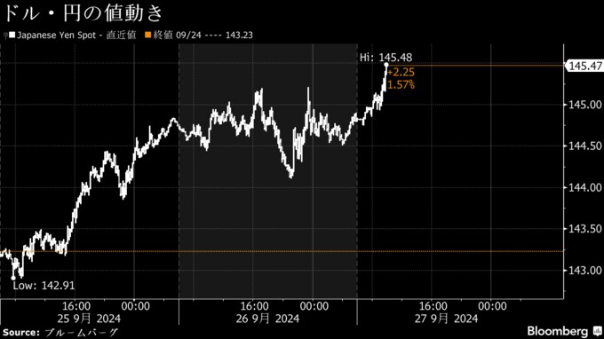 円は対ドルで145円台半ばに下落、自民党総裁選を警戒-3週ぶり安値