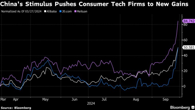 アリババなど中国の消費者向けテクノロジー株急伸、刺激策の発表受け