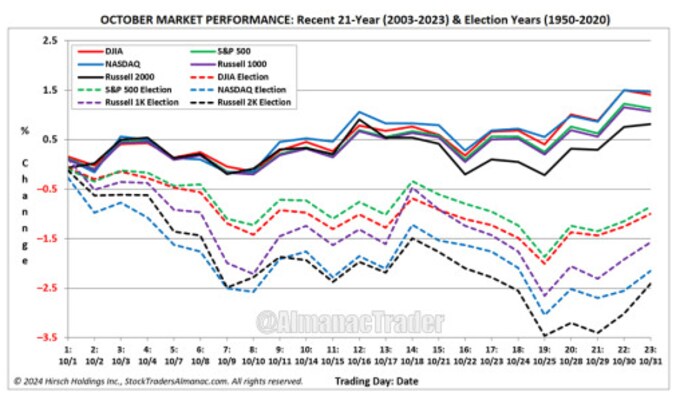 過去21年の10月の株式パフォーマンス、点線は選挙年