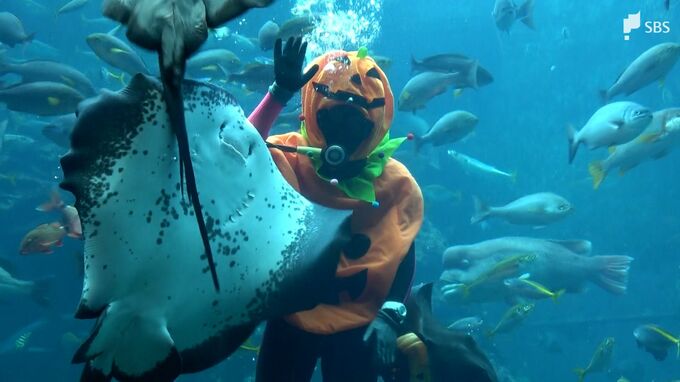 カボチャに仮装!?ダイバーが餌付けショー 魚たちに"エサを配って"ハロウィーン=…