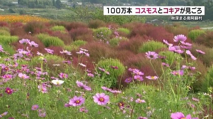 南阿蘇村で秋風に揺れる100万本のコスモス 赤いコキアも見ごろ 熊本