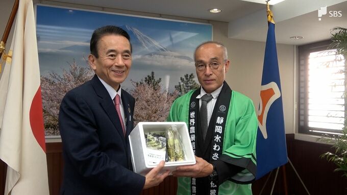 産出額日本一誇る静岡県産わさびをPR 生産者が本わさびを鈴木康友知事に贈呈=静岡