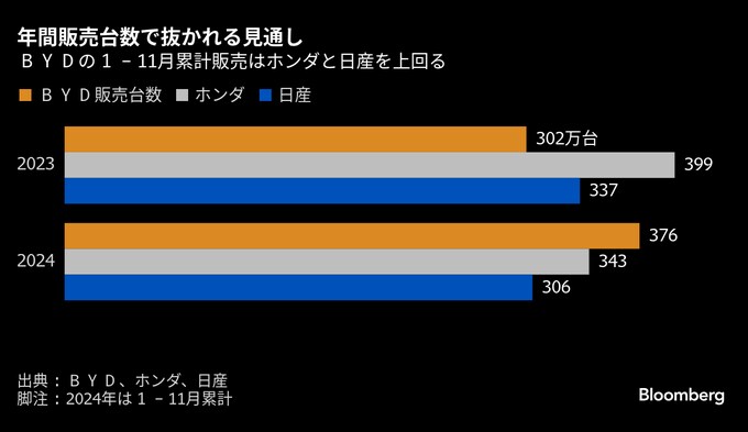 3. ホンダ・日産、年間販売台数でBYDに抜かれる見通し-単独で勝てず