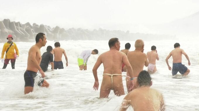 雪残る中で「寒中水泳大会」 ふんどし一丁で真冬の日本海へ…「気持ちいい」「元気…