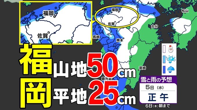 【大雪に関する気象情報】福岡 山地50cm 平地25cm 予想降雪量「立春寒波…