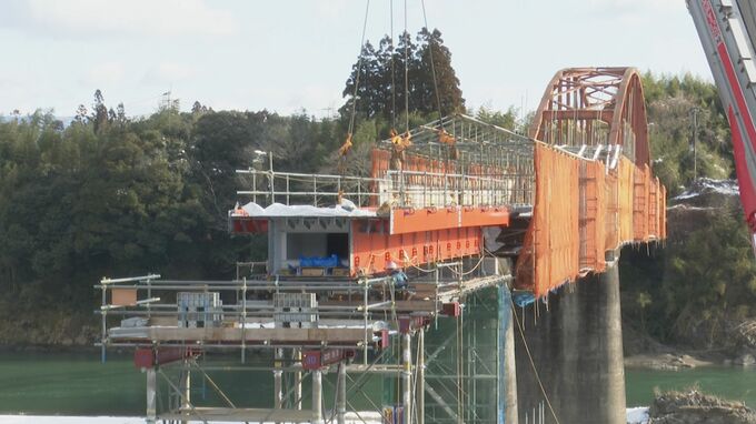 豪雨で一部崩れた『天狗橋』復旧へ 橋桁架設工事始まる 熊本・人吉市