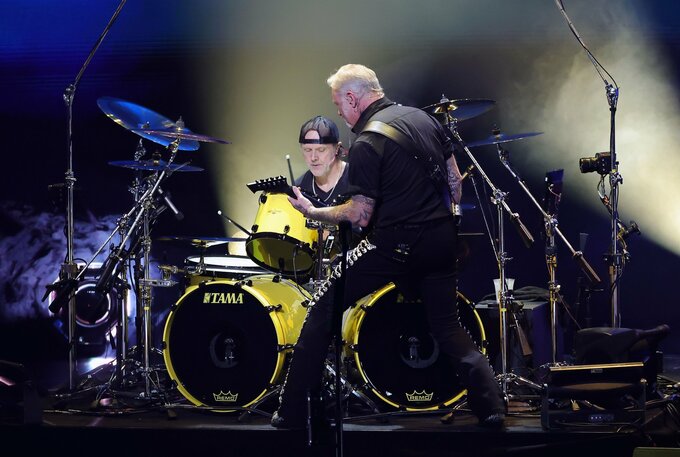 ステージで演奏するメタリカのラーズ・ウルリッヒ氏とジェイムズ・ヘットフィールド氏(2024年12月)