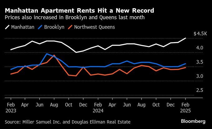 NYマンハッタンのアパート賃料、2月は過去最高-27%が入札合戦に
