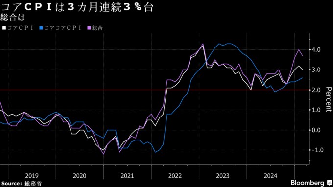 3. 消費者物価は3カ月連続で3%台、予想上回る-日銀利上げ観測後押し