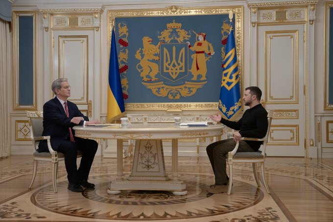 ベッセント米財務長官(左)とウクライナのゼレンスキー大統領(キーウ、2月12日)