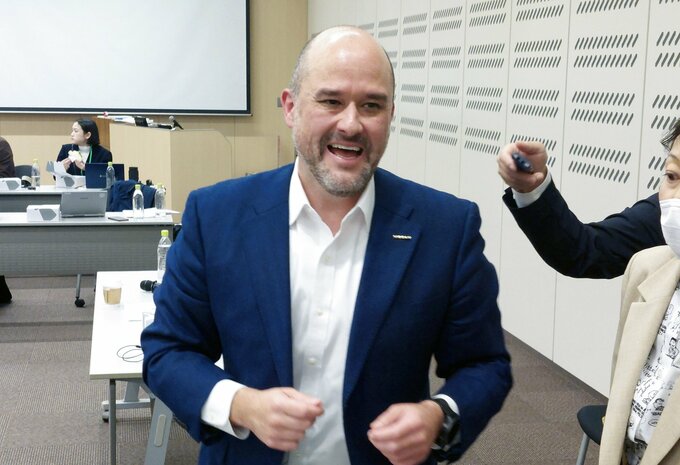 記者の質問に答えるエスピノーサ氏(25日、神奈川県厚木市)