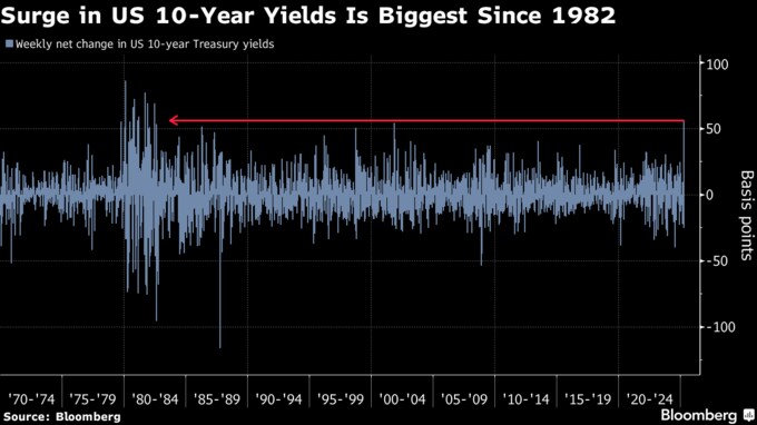 米国債売り膨らむ、10年債利回りが週間で1980年代以来の大幅上昇