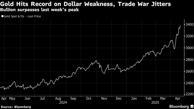 金スポット価格、3430ドル超え史上最高値-ドル安進行や貿易戦争懸念