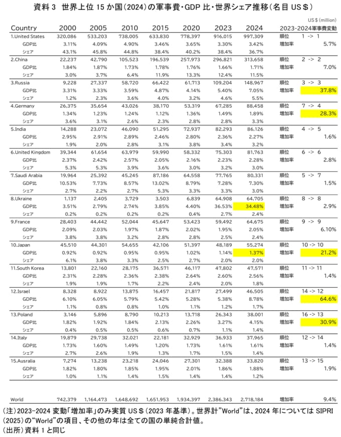 3. 【軍事費ランキング2024】米国が圧倒的トップの世界シェア36.7% 「ヤルタ2.0」を連想させる米中露で53.7% 日本は防衛費増額もGDP比では低水準
