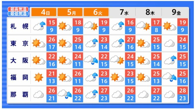 GW後半の天気は雨の日が多いか 全国各地の観光地・都市の週間天気を画像でわかりや…