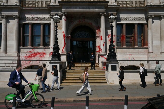 赤い塗料で落書きされたJPモルガンのロンドンのオフィスビル(5月14日)