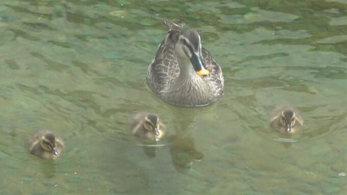 カルガモ親子が病院の中庭に 5羽のヒナが愛らしい姿 患者や職員の心を和ませる …
