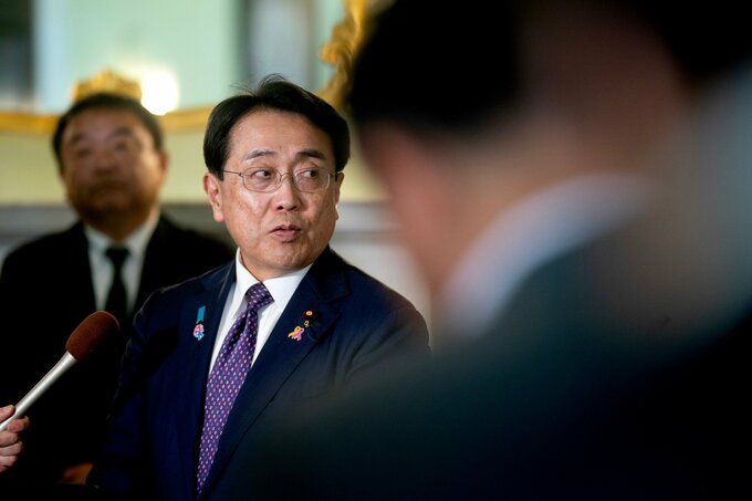 記者団の質問に答える赤沢亮正経済再生担当相(30日、ワシントン)