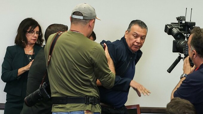 動画:ノーム国土安全保障長官の記者会見場で取り押さえられ手錠をかけられるパディヤ上院議員
