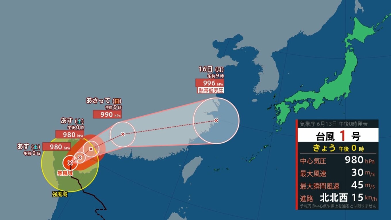 【台風情報】「台風1号(ウーティップ)」暴風域伴い時速15キロで北上中 最大瞬間…