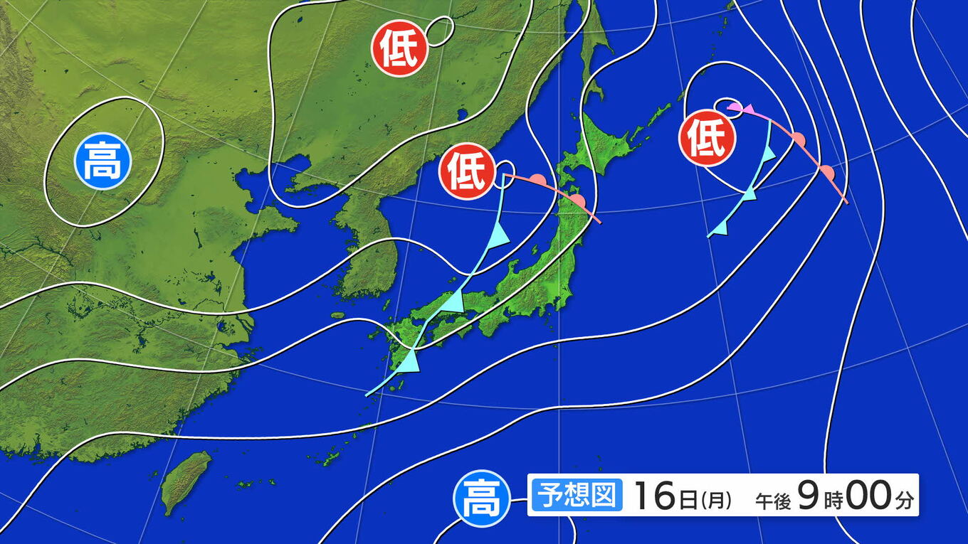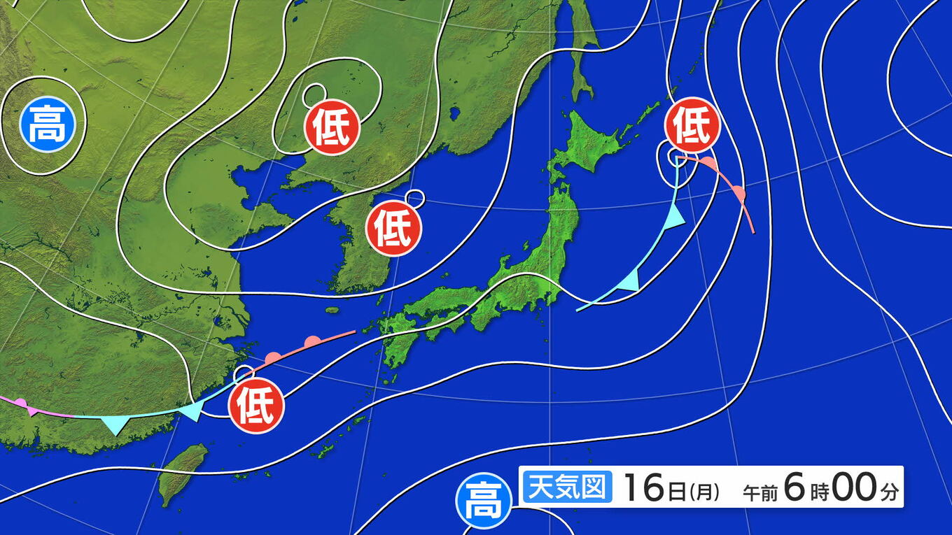 東シナ海の低気圧と前線は、日本海にある〈低気圧〉と一体化し、寒冷前線が九州を通過する