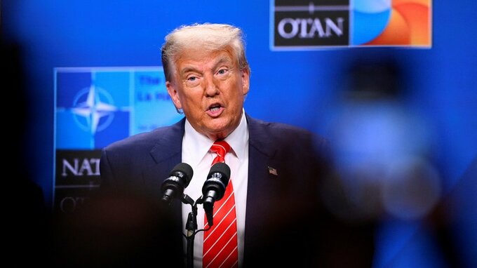 ハーグで記者会見を行うトランプ米大統領(25日、動画)