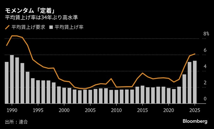 25年春闘賃上げ34年ぶり高水準、勢い持続で連合の目標達成-最終集計