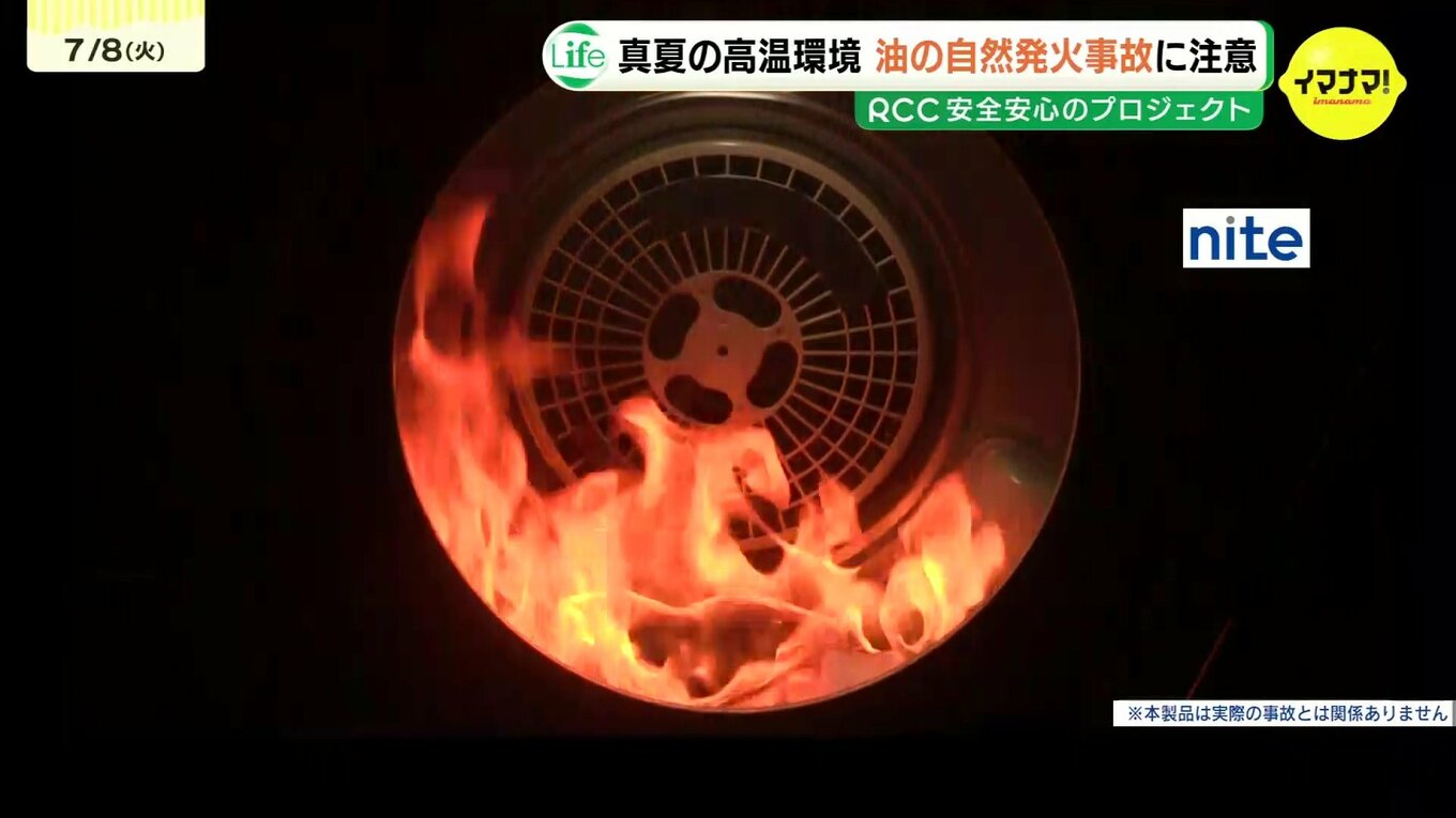 オイルを拭いたタオルを洗濯乾燥機にかけると発火するかも…真夏は油の取り扱いに注意
